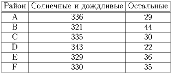 Туристическое бюро хочет провести исследование о количестве солнечных и дождливых дней в году. Была собрана информация по шести районам и занесена в следующую таблицу: